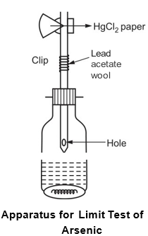 | 1. A known amount of dilute arsenic solution is kept in the wide mouthed bottle of the apparatus. | 1. Test solution: Dissolving specific amount of sample in water and stannate HCI (as free) and kept in the wide mouthed bottle of the apparatus. |