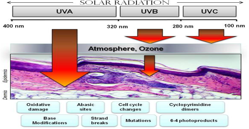 Repeated exposure to sunlight causes sunburns, loss of elasticity and wrinkling of the skin.(photoaging)