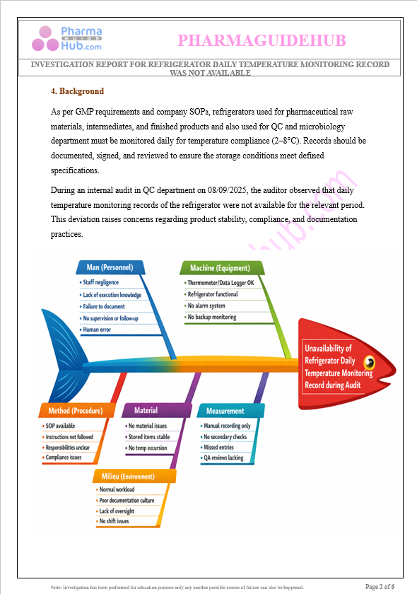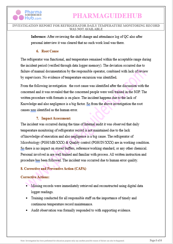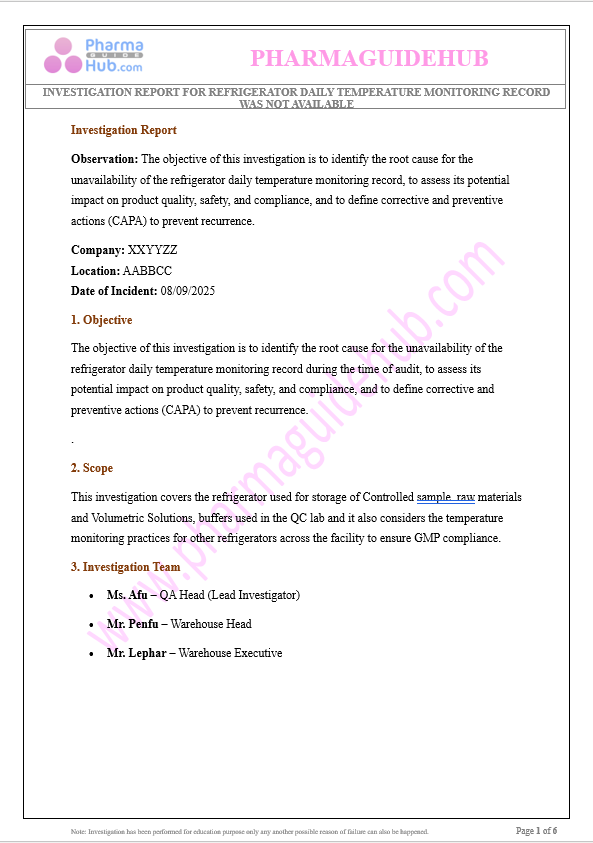 Observation: The objective of this investigation is to identify the root cause for the unavailability of the refrigerator daily temperature monitoring record, to assess its potential impact on product quality, safety, and compliance, and to define corrective and preventive actions (CAPA) to prevent recurrence.
