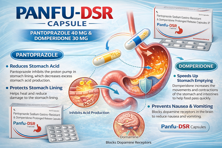 PANFU-DSR Capsule is a medicine that is used to treat conditions like acid reflux disease (GERD), erosive esophagitis, gastritis, gastric and duodenal ulcers, and indigestion with symptoms like heartburn, bloating, and regurgitation. It works by lowering acid production and helping the stomach empty faster.